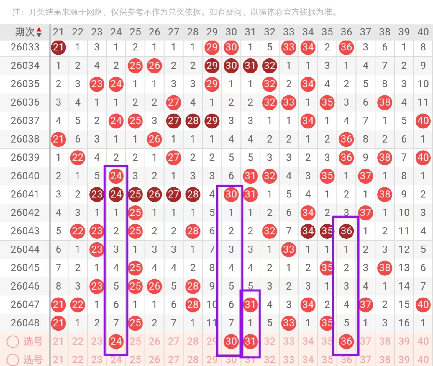 二区21-40:二区间,上一期回补了4个号码的下落,从近期二区间号码下落点位来看,呈现出了由热转冷的形态,今天我们要重点关注的是二区间空缺位置的回补和对子,下面的一个回补点位,在二头,首先我们要重点关注的是23-24的一个回补点位和30-31的一个回补点位,今天这里可用32+33和24-31的搭配回补,这里值得我们重点关注的是开出对子下落的可能,回到3头中部位置,这里要重点关注的是梅花形态号码的一个下落点位,32-36值得我们重点关注,其次在尾部位置要重点防的是大遗漏的下落。