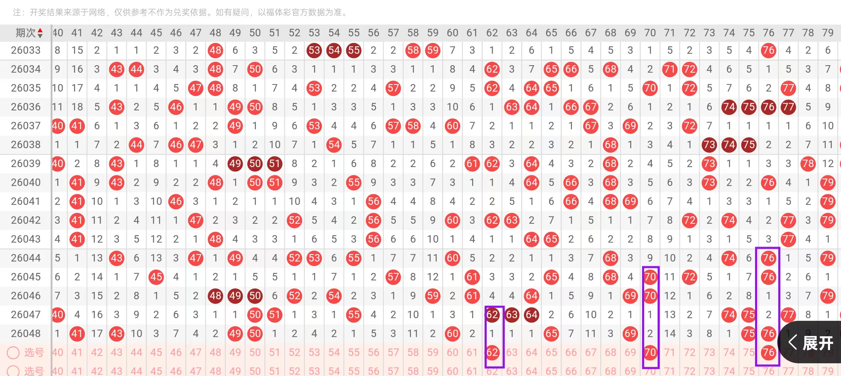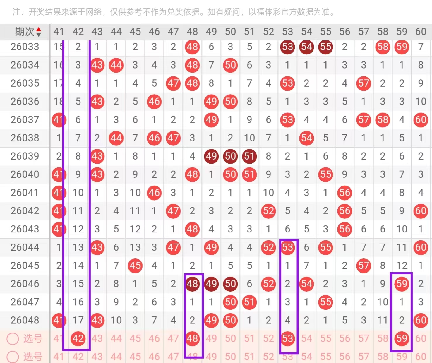 三区41-60:三区间,上一期回补了5个号码的下落,从近期三区间号码下落点位来看,呈现出了由冷转热的形态,今天我们要重点关注的是三区间空缺位置的回补和大遗漏的下落点位,在4头,首先我们要重点关注的是42-44的一个回补点位和48-49的一个下落点位,今天这里可用42-48和44-49的一个搭配回补,回到五头位置,今天这里要重点关注的是52-53和58-59的一个搭配回补,这里要重点关注的是53-59和52-58的一个奇偶搭配组合回补。