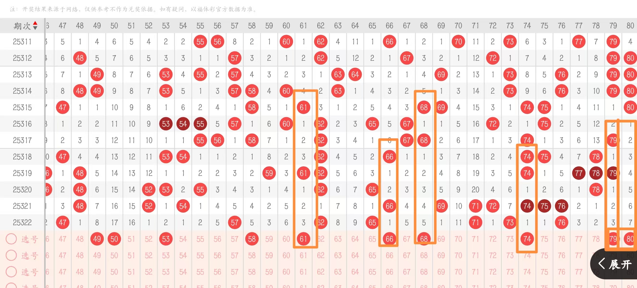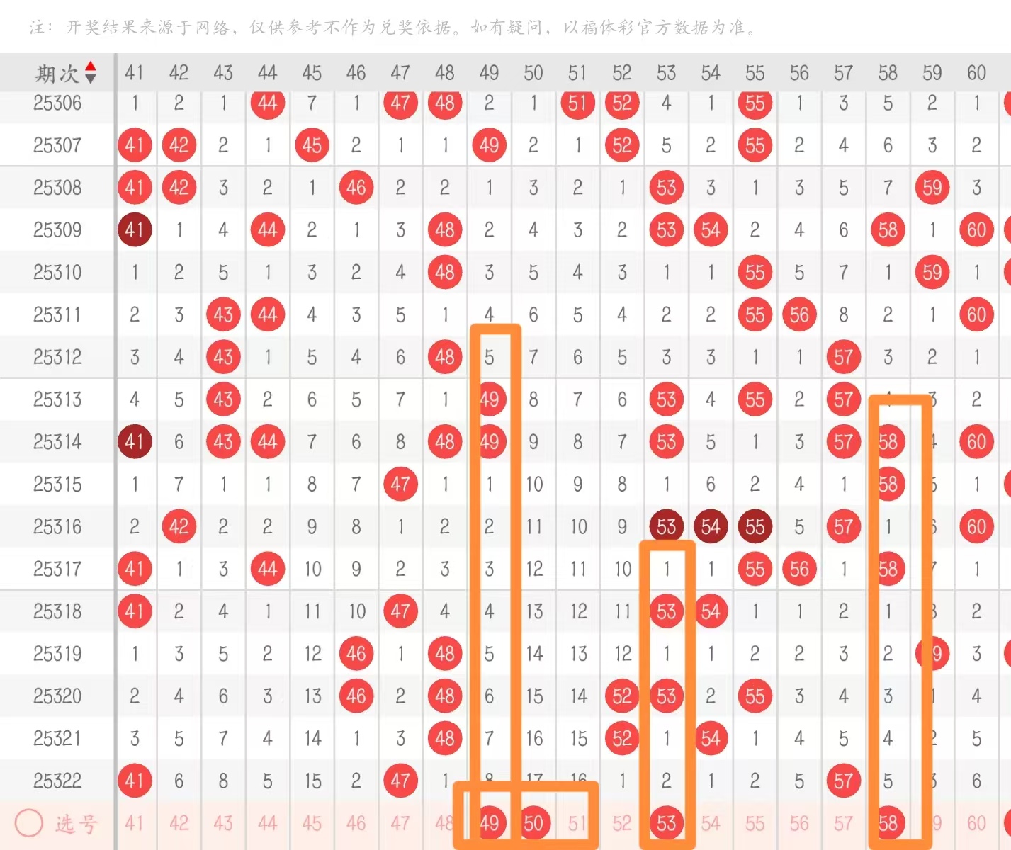 三区41—60:三区如果说在考虑号码当中的话,尽量以大遗漏成对子的形态回复较为合适,不然的话形态带动的话比较弱,这种大遗漏回补没有太强的点,尽量不要去主做回到5字头上面,在拉扯的条件当中,53和58本期是作为57的形态关联码以及分边位置重点看的一些下号点,并且56 58又可以作为5期的下号点,这也是我们常说的一种形态的选号。