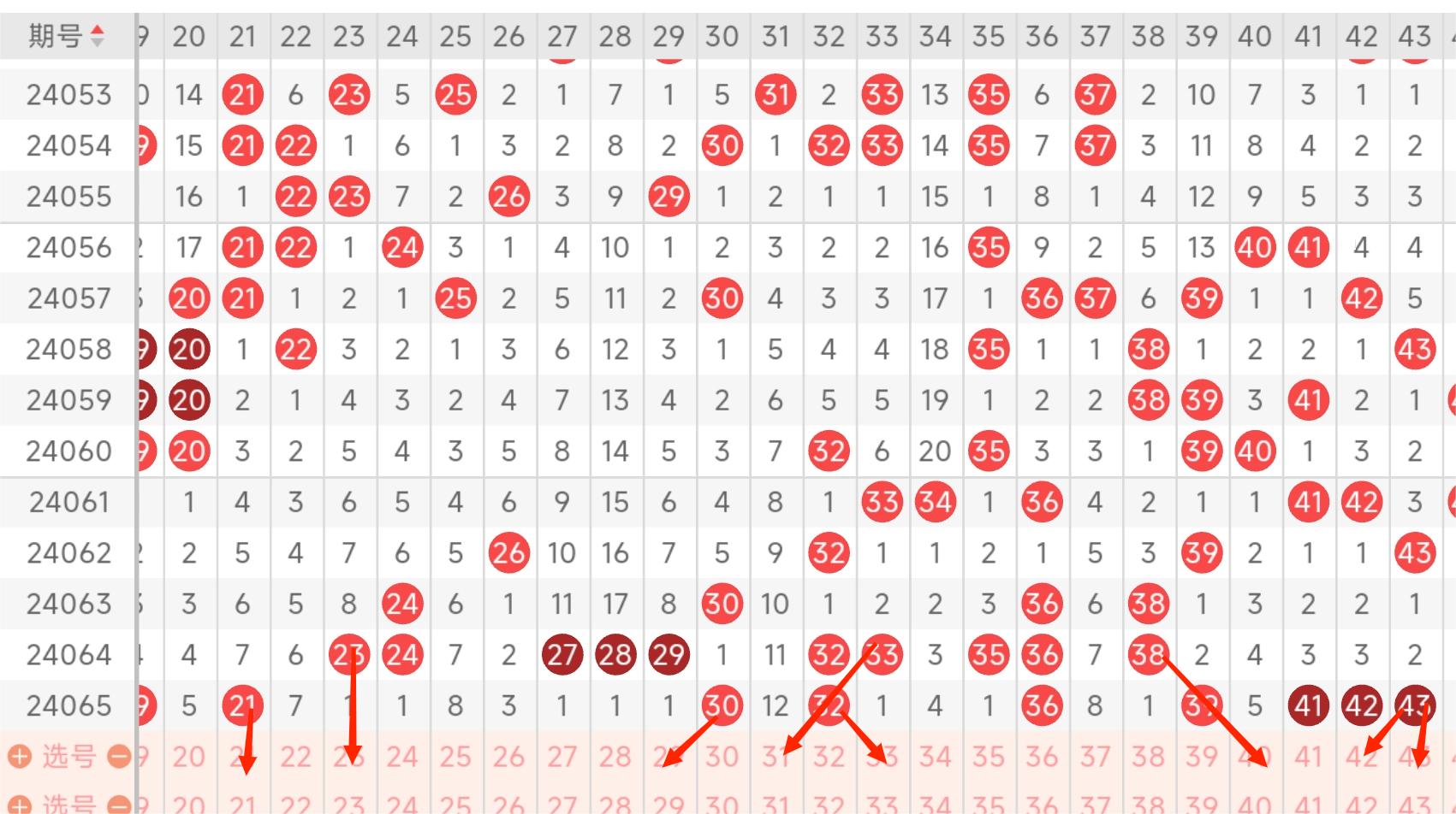 区间分析:24064期开出二个号码球和24065期开出五个号码球,三区的号码球在24065期有号码球41和号码球42和号码球43号球的邻号球三连走势,本期注意号码球42号球和号码球43号球的连出走势和号码球48号球的连出走势,注意三区的斜开奖走势开出号码球54号球和号码球52号球的斜开奖走势开出和预防号码球56号球的遗漏二期开出走势(24060期和2024063期是遗漏二期开出走势)