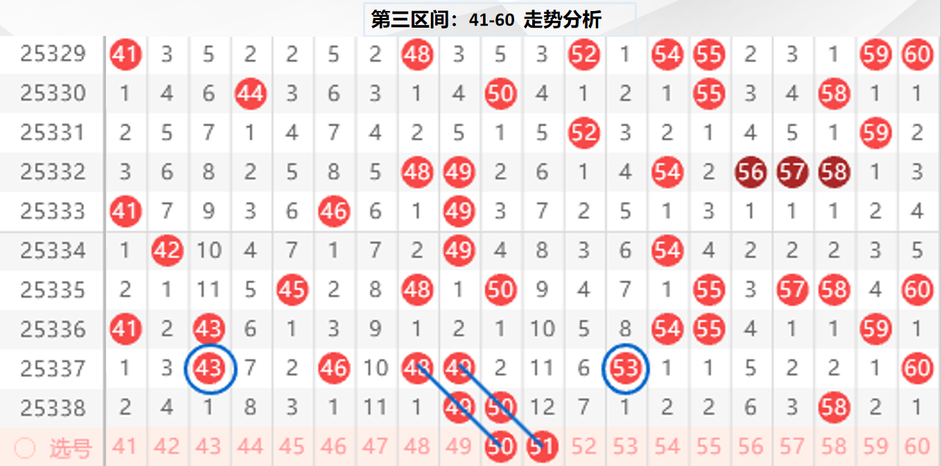三区分析:【41-60】(走势图标注号码非小黄车大底,请谨慎参考,具体思路将在直播间分享讨论)