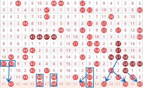 本期的42号数字是属于空三中心号,本期的空三中心号有4个,出一个的机会还是有的,我们重点考虑一下42 55号数字的出号情况就可以了。上期开出了44 46 48号数字,那么本期我们就要注意出重号的情况了,重点考虑一下46 48号数字走重的情况。本期58 60号数字都是三斜连号码,我们要注意出一个号码的情况,尤其是60号数字的出号机会还是很大的。
