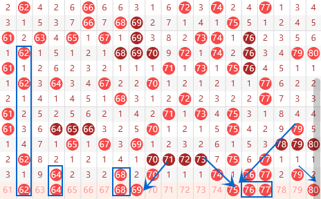 该区间的62号数字是属于141走势,可以关注一下。本期的68 69我们也是要注意出一个号码的情况,68我们可以做防守,重点关注一下69号数字。75号数字是属于梅花号码,本期的梅花号码有4,应该是有机会出一个的,这里我们要注意一下。连号空一带号76 77 79我们要注意出重号的情况,重点关注一下76 77出重的情况。本期的80号数字我们可以关注一下,出号机会还是有的。