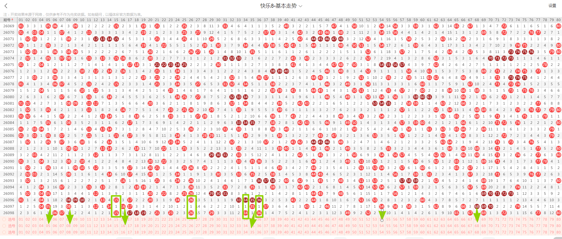 从这张走势图可以看到绿色方框标出来了遗漏一期的示意号码,开出了隔期(遗漏一期的)4个号码(绿色方块标示的),数量与上期减少,从近期走势图看隔期码回温态势形成,本期判断热度继续回温,落号6个号码概率较大(绿色箭头标示的05、08、16、35、54、68)需要关注,有下号概率;