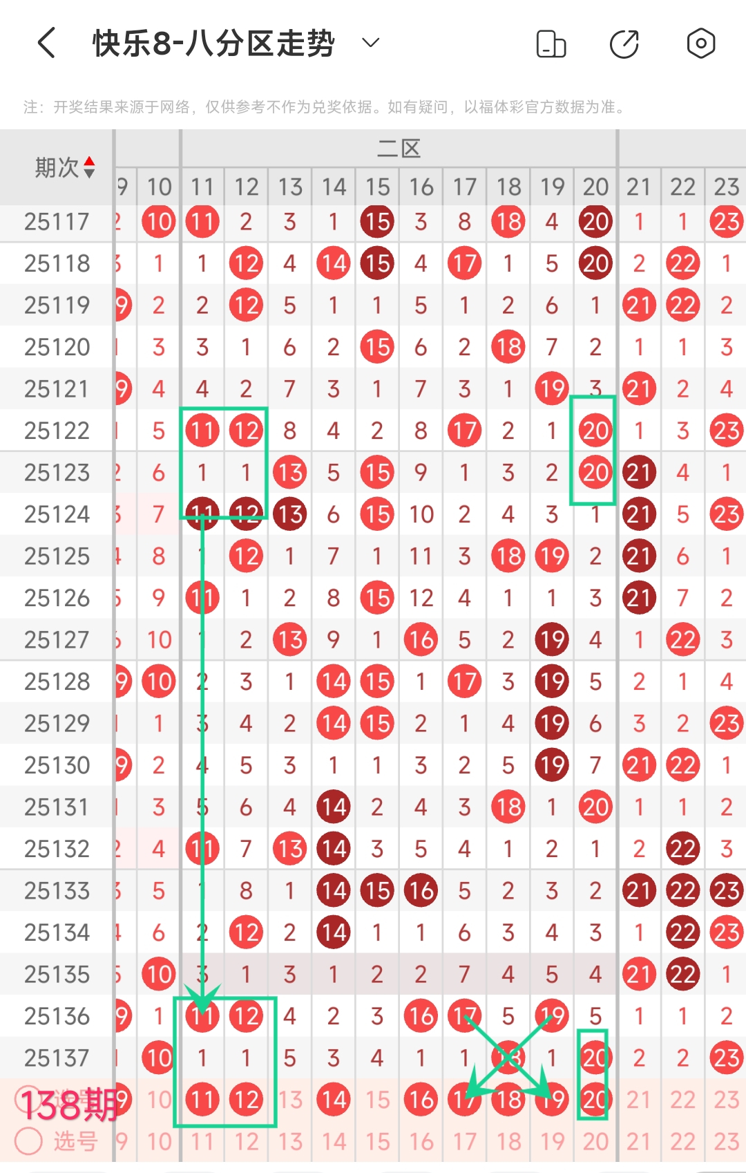 上期二区开出18 20个2号码,上期回温,本期应该出2个左右。