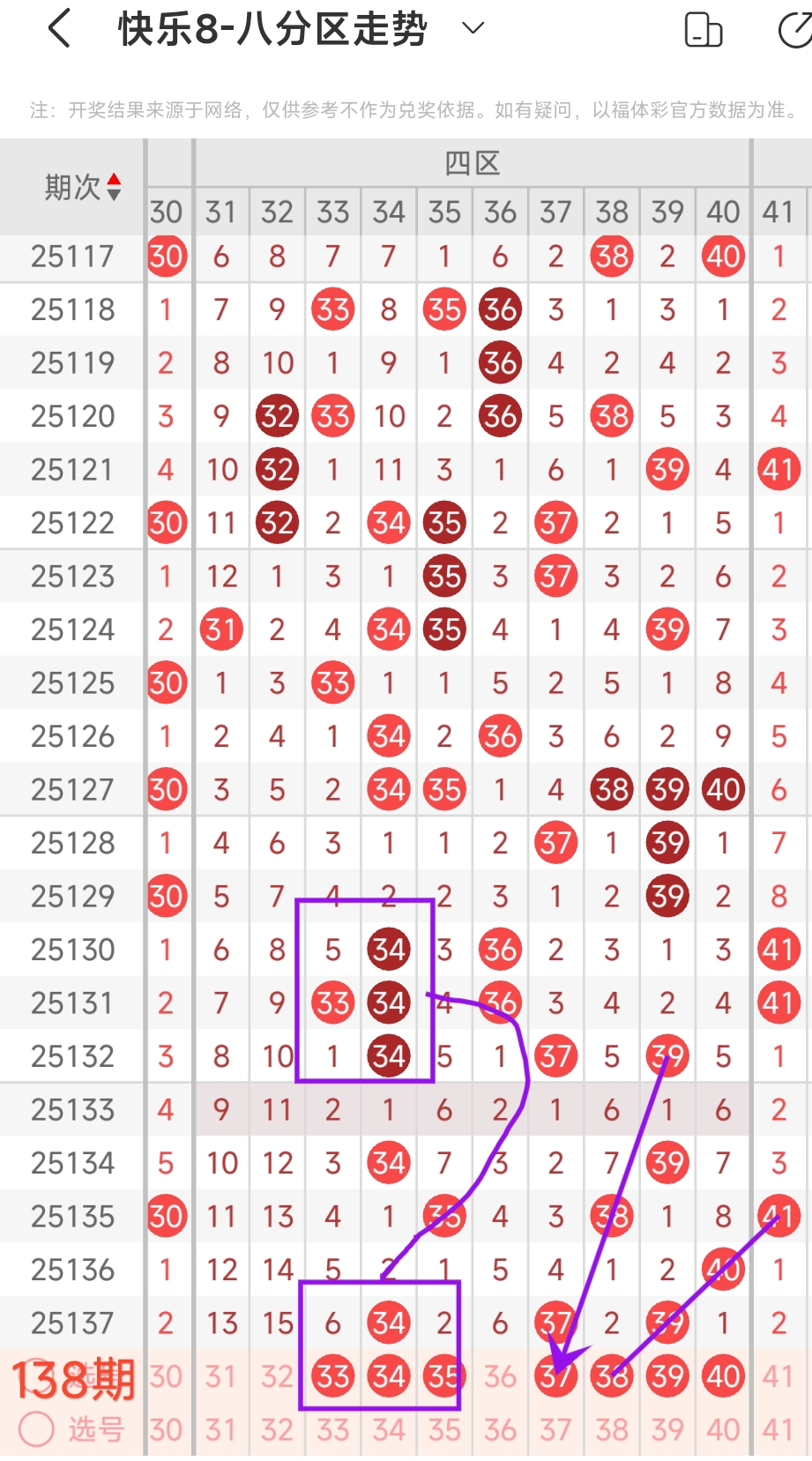 在快乐8的探索之旅中,通过对开奖走势图细致入微的观察,我们总结出一些具有参考价值的规律。几乎每一期开奖号码都呈现出以下显著特征:其一,大概率出现连号;其二,常常伴有边码;其三,遗漏值为1 2 3的号码频繁现身;其四,重号现象也较为常见。掌握这些要点,能为我们的投注提供方向指引。我们约定采用八分区走势图来展开分析。