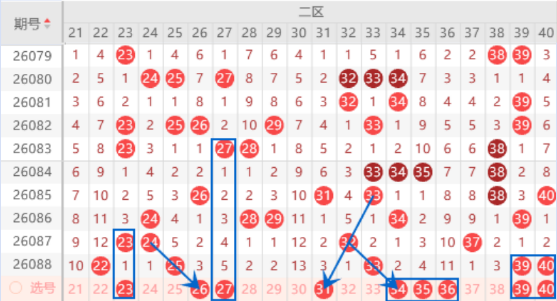 该区间的23 24号数字我们注意出一个号码的情况,其中的23号数字我们可以重点关注一下出号情况。本期的26号数字是属于三斜连号码,出号机会是有的,可以关注一下出号情况。本期的31号数字是属于363走势,出号机会也是有的,可以关注一下。本期的34 35 36号数字我们注意出一个号码的情况,其中的35 36号数字可以重点关注一下出号情况。上期开出了39 40号数字,我们注意一下出一个重号的情况,其中的39号数字可以重点关注一下。