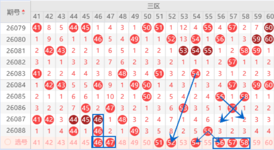 该区间上期开出了44 46号数字的重号,本期我们注意一下出三重号的情况,其中的46号数字可以重点关注一下出号情况,本期可以防守一下46 47号数字同出的情况。本期的51 52号数字我们注意一下出一个号码的情况,其中的51号数字可以防守一下出号情况。本期的54号数字出号机会也是有的,我们可以防守一下46 54号数字同出的情况。本期的56 58号数字是属于交叉对称回补号码,本期是有机会出一个号码的,我们重点关注一下58号数字出号情况。
