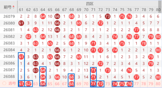 该区间的61号数字是属于243乱序走势,出号机会是有的,我们可以防守一下61 62号数字同出的情况。该区间上期开出了64 71号数字的重号,本期我们注意一下出一个三重号的情况,其中的64号数字可以重点关注一下出号情况。本期的68号数字我们注意一下出重号的情况,本期可以防守一下68 72号数字同出的情况。本期的75 76号数字我们注意一下出一个号码的情况,其中的75号数字可以重点关注一下出号情况。