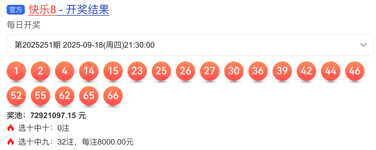 回顾25251期开奖号码:01、02、04、14、15、23、25、26、27、30、36、39、42、44、46、52、55、62、65、66