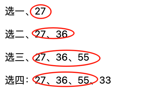 同尾号:1尾1个(01),2尾4个(02、42、52、62),3尾1个(23),4尾3个(04、14、44),5尾4个(15、25、55、65)