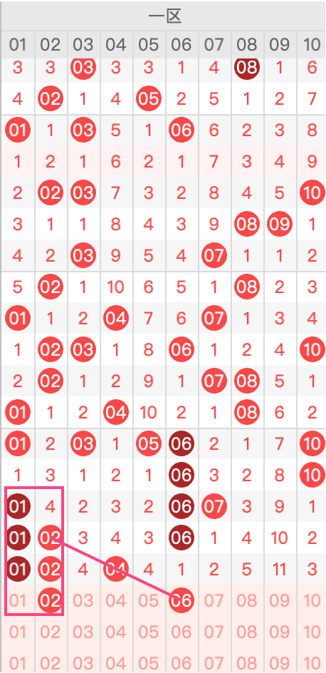 二区上期开出3个热度还是居高不下,每期基本都能出3个左右,01、02还接着重开,本期一区主选02号,一个三重号的一个走势,搭配一个06一个间隔斜连的走势
