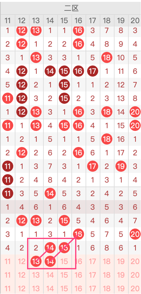 二区还是处于比较平淡的一个区域目前还没向上有所回升,开出14、15连号,预计未来几期之内有回升空间,保守选择我们选择两个,主选14的一个三斜连的一个走势,搭配13号一个小斜连,同时还是连号回补号