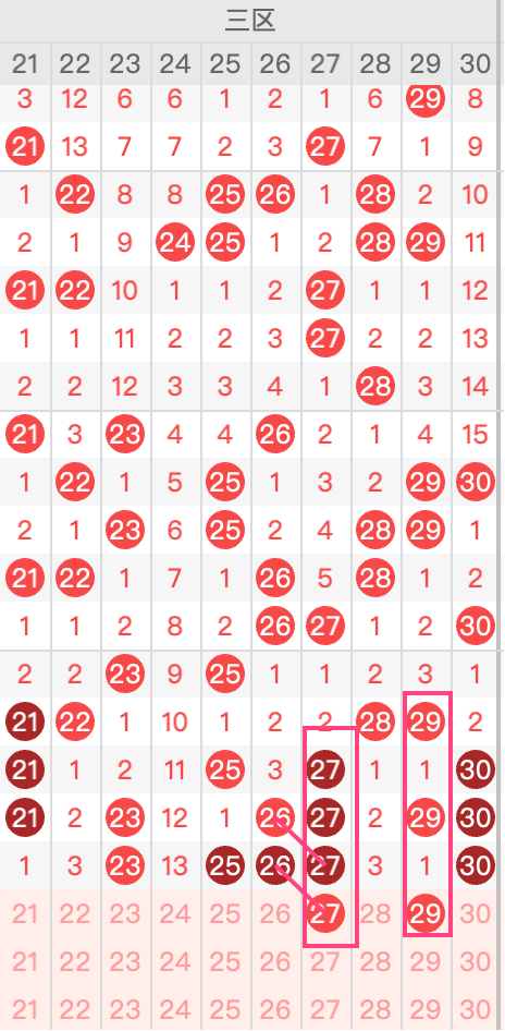 上期我们选择25、27都开出来了,走势比较好,这期估计开不出来那么多个,会慢慢下降,这期我们选择两个号即可,主选29一个间隔斜连,搭配一个27多4重号
