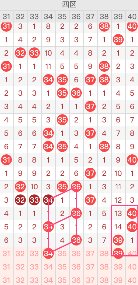 四区一直以来都是平平无奇,毫无起来的空间,还是保守选择,主选39一个重号邻号的一个走势,副选34与上期的36单间隔形成一个间隔斜连,非常不错的选择
