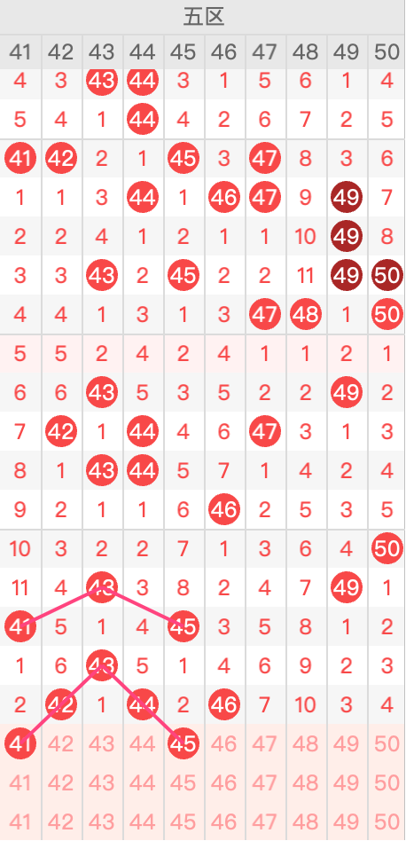 五区上期开出号码3个,感觉这期会开始起号,看的好的话这期可以多选一个到两个,这区我们主选41搭配45形成一个八字,与上两期形成呼应,也是两个3斜连号,有望开出