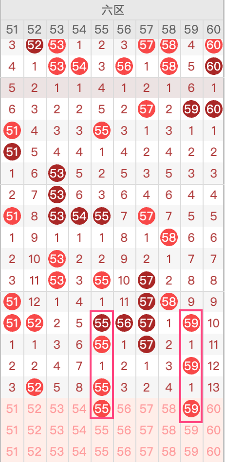 六区上期开出号码两个,走势上面来看这期有望会达到四个,但是我们还是保守选择。主选55号,2重号,隔期2重号,该走势,前面很少开出,也很看好这区的55号,搭配一个单间隔的59号