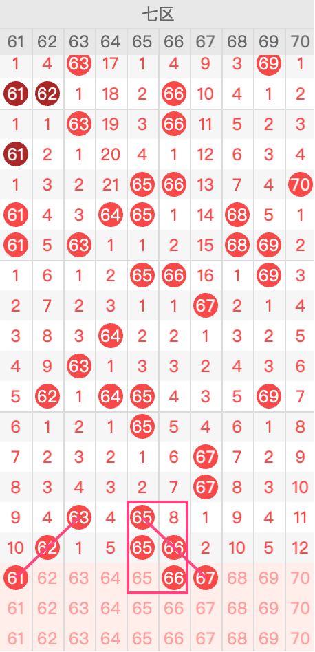 上期七区开出号码3个,62、65、66,这区我们选择他上期的斜连走势和邻号重号走势来选,主选61号一个三斜连副选66号邻号重号,搭配67号组成二连,也是65、66的一个二连回补