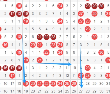 上图是福彩快乐8开奖号码走势图中的其中一部分走势图,看上面标注出来的这个区域,这个区域的数字从19到26。我在上面走势图中标注出来的蓝色箭头的中间这个区域数字最近两期是一个都没出现。那么本期这个区域的数字大家要重点关注,关注数字19到26这个区域出号码2个或者3个。