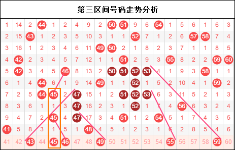 第三区间思路:三区居然五字头断区了,其实这倒也符合走势,毕竟前期已经表现出比较冷淡的走势。而上期的号码除了开出一个冷号的邻号,剩下的完全是一个不着边际的号码。那本期从走势上我们还是要小心一点,毕竟断区能不能回补出号码还是个未知数。