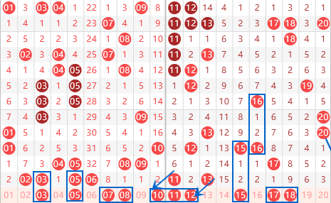 该区间上期开出了连号02 03和连号05 06,本期我们要注意这里出重号的情况,重点关注一下03 05走重的情况。本期的07号数字是属于遗漏8期的号码,本期遗漏8期的号码有2个,本期应该会出一个,我们要注意了。08号数字是属于151走势,可以关注一下。上期开出了11号数字,那么本期我们就要注意10 12的出号情况了。本期的17号数字是属于181走势,可以关注一下。