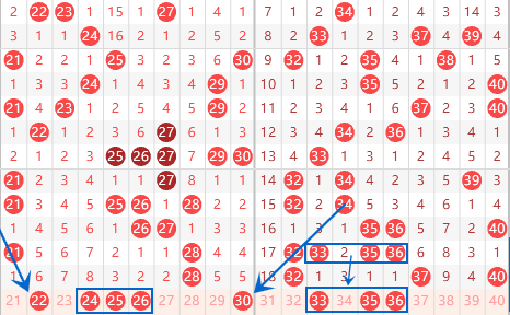 本期的22 23 24应该是要落号下来,我们要重点考虑一下这里出2连号的可能了。连号26 27我们要注意一下落号情况。本期的30号数字我们可以关注一下,还是有机会出的。连号空一带号33 35 36本期我们要注意落号情况。