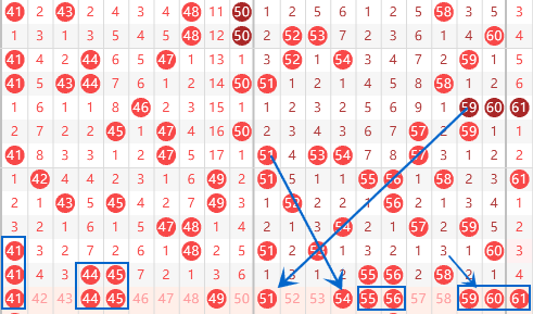本期的44 45号数字我们要注意走重的情况,重点考虑一下44走重的情况。本期的51号数字我们可以关注一下,断斜连对称还是有机会出的。本期的55 56我们也是要注意落下重号的情况的,机会还是大的。本期的59 60我们就要注意落下连号的情况了,上期看好,没能落下,本期在追一起看看。