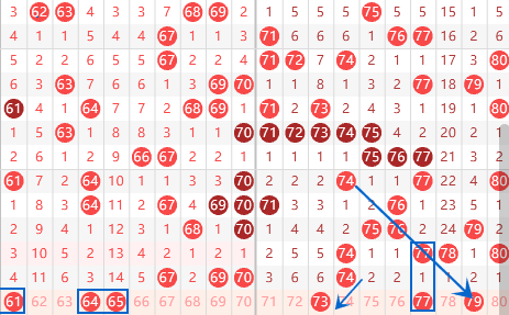 本期的64 65我们关注一下,出一个的情况还是有的。本期的73号数字我们要重点关注一下,出号机会还是大的。连号空一带号77 78 80号我们要注意落号情况,重点考虑77 78的落号情况。