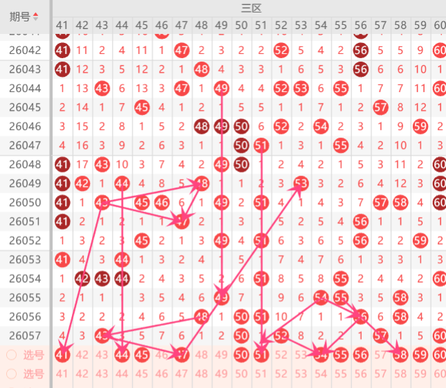 而三区的打底号是41.43.44.46.47.49.51.58.59.60中参考3-4码开出机会,