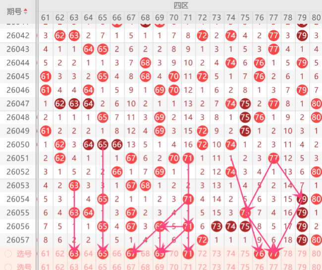 四区在近期的走势上来判断机会的话,整体区间开出走热形态,上期四区间区开出了3码,而且上期区间开出的形态是重码回补夹号和分边走势,上期小妹在区间布局到了1码开出,上期四区间断前半区。那么本期四区间我们重点关注的形态是隔期回补,空位回补,本期首先注意隔期回补上的65.67.69.71.号中布局布/1-2码回补机会,而空位回补上的62.66.77.76中参考1-2码回补机会,那么本期重点关隔期回补上注在。一码订胆参考3-4码开出机会,如图所示