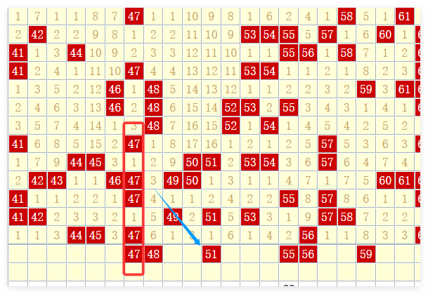 然后,我们再看一下第三分区的号码的一个分析,40号60~40这个区间,那这个区间的话,我们也是要看一下上一期的开奖情况。上期四十四四十五四十七和56。那么本期的话,我们还是要围绕一个重点的号码56号进行左右的号码,一个配合的一个搭配情况: