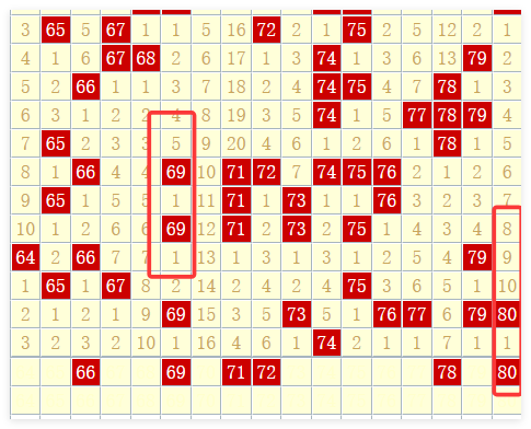 最后看一下最后一个大分区七字头的号码,那六字头七字头也是非常关键的一个区间呢。上一期开了比较少,开了62号和六七十四号。本期我们还是要重点的看一下69作为一个隔期码,可能会起到一个组合上起到一个承上启下的一个作用。那么69的组合呢,我们要观看一个6669,一个6971697172,这是69的一个作用。其次我们要看一下74的一个号码搭配的话,我们要关注一下七十八七十九八零,这里有在定位上是有号码产生的,所以说最后一个分区,我们还是希望大家关注一些热组合,697172和787980