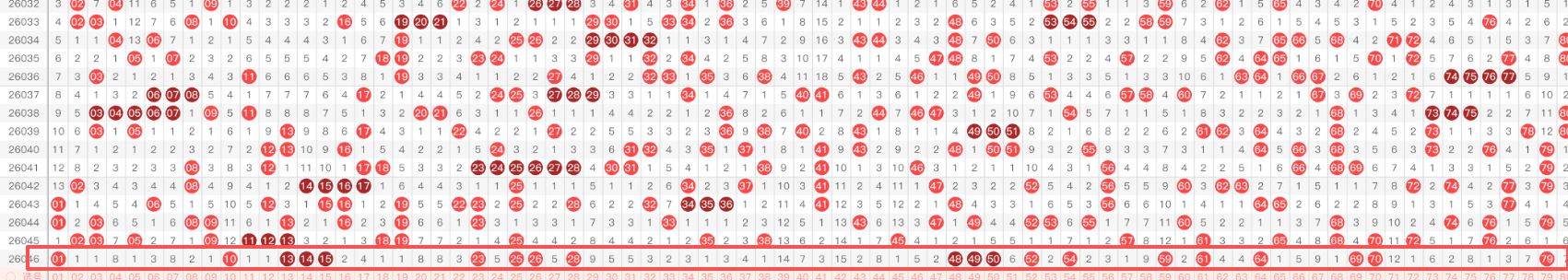 19与23:19作为上期重号(2026046期重点推荐),具备“二连出”潜力;23则填补21-26的奇数缺口(21-22-23-25-26),与19形成“19→23=4步”的等差数列雏形,增强号码组合的数学规律性。
