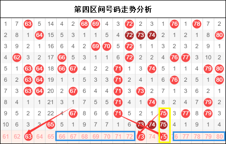 第四区间看起开又进入了一个举步维艰的时刻,仅仅开出了四个号码,且在走势上毫无研究价值。似乎与之前的走势一下子拉开了距离,酝酿着新一轮的走势。尤其是昨天开出了四区最冷的号码65,在一楼了22期的走势下,会不会将这种走势延续,顺带出四区其他相对渐冷的号码,这是本期要注意的一个问题。
