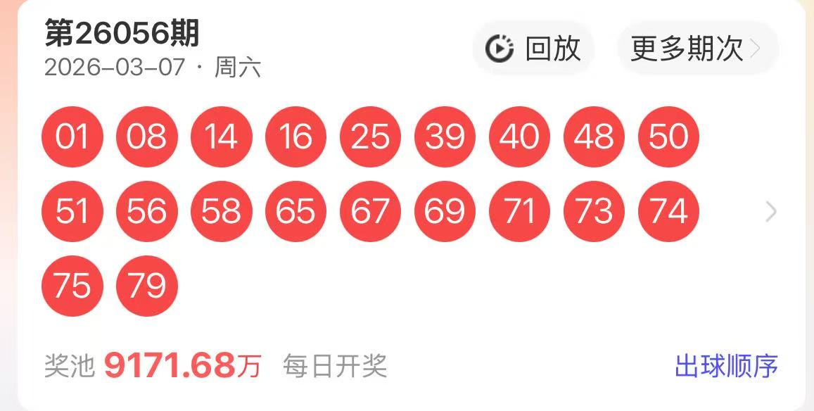 下面是我对2026057期福彩快乐8的分析和预判,希望通过我的分析能让大家今晚大满贯!福彩快乐8上期开奖号码如下图
