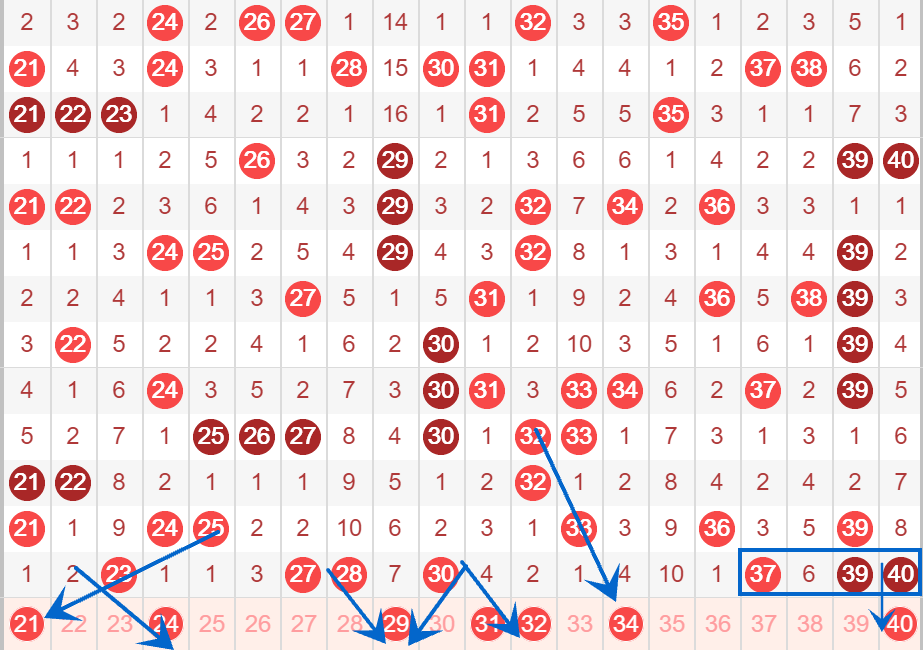 该区间的21号数字我们可以关注一下,重号下面空一带号还是很容易出的。23 25 27形成了三角形,由于有24号在,所以本期的24 25 26号数字应该会落一码下来,我们可以好好抓一抓。29号是属于夹号类型,本期的夹号有6个,开出2个的机会还是有的,我们需要注意一下。37 39 40号是数以连号空一带号类型,那么本期这里我们需要注意一下出重号的可能。