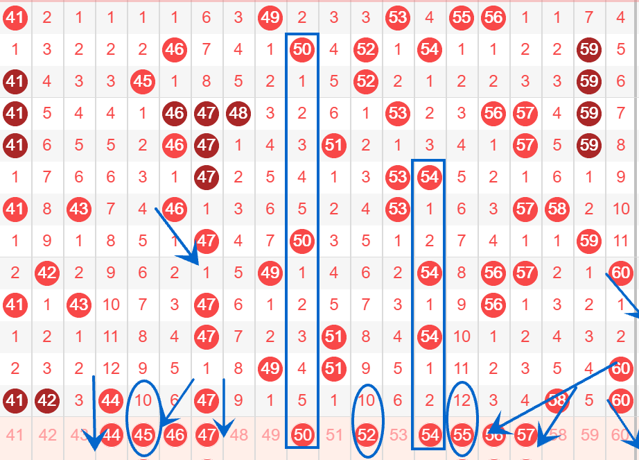 44号上期开出来了,那么本期的45号数字我们就要注意了,而且本期45号是属于遗漏10期的号码有三个,本期需要注意出一个的情况。本期54 55 56 57我们需要注意一下出号情况,需要防守一下出连号的情况。