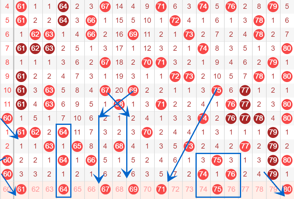 连号61 62号已经同时遗漏了3期了,本期我们要防守它落下一码来的情况。中心对称67 69已经追了3期了,本期还是想追一期看看,不出可以放弃了。本期的75号是属于梅花形态,由于近期这种形态的号码近期出的比较多,所以本期我们也是需要做好防守。
