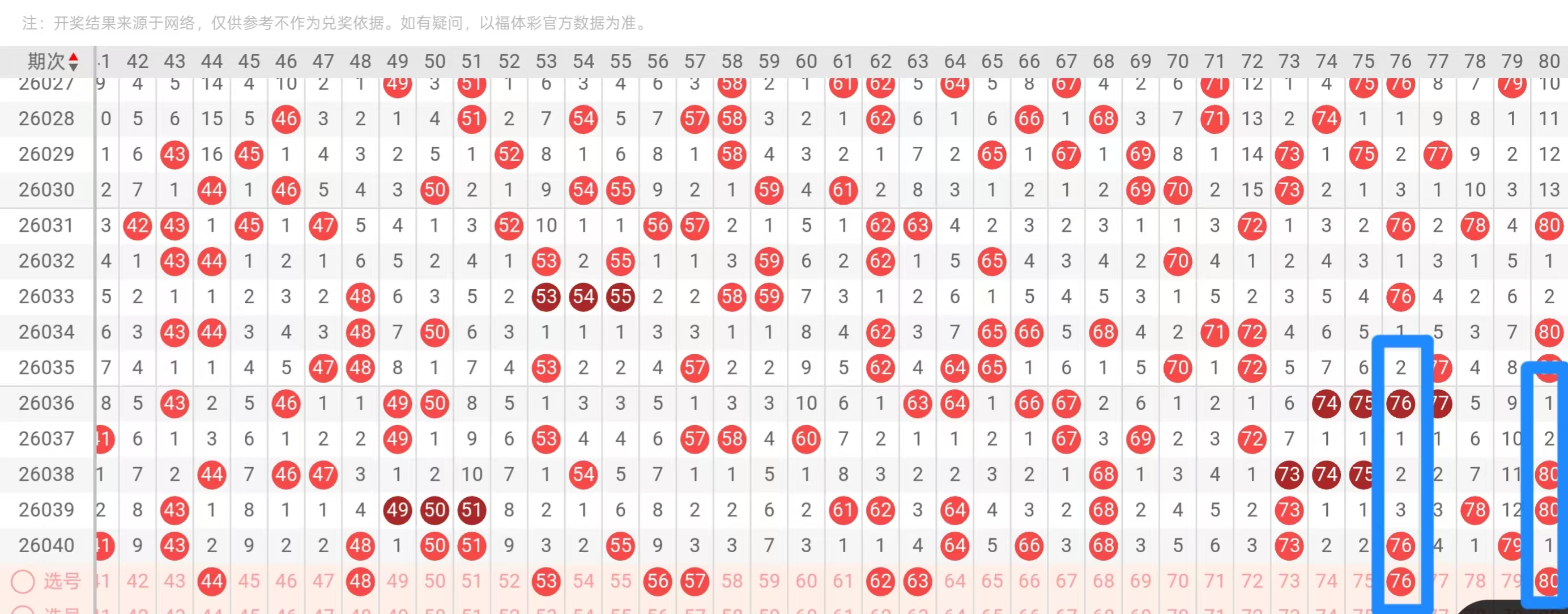 四区61-80:本期的6字头上面大家尽量以封面为主,比如说对子的空一会补61 62的形态更好的是62,然后64作为双重分边的话可以保留63,值得注意的是这里开出了一个偶数的连号,那么形态态当中的话,插空位置尽可能保留一码就行了,回到68 73,这已经连续三期走重,中间没有号码,如果说大家实在想拿的话,尽量还是以70为主,回到70层的尾部做好,本期来说这里开的也是同形态的369尾同路的,那么我们选择一码走出,然后去搭配尾部的80 ,80是个大形态的倒置形态,大家可以往上面看它的遗漏走势,包括自身形态的重也是一模一样的,所以整个四区的话尽量以这些号码为主。