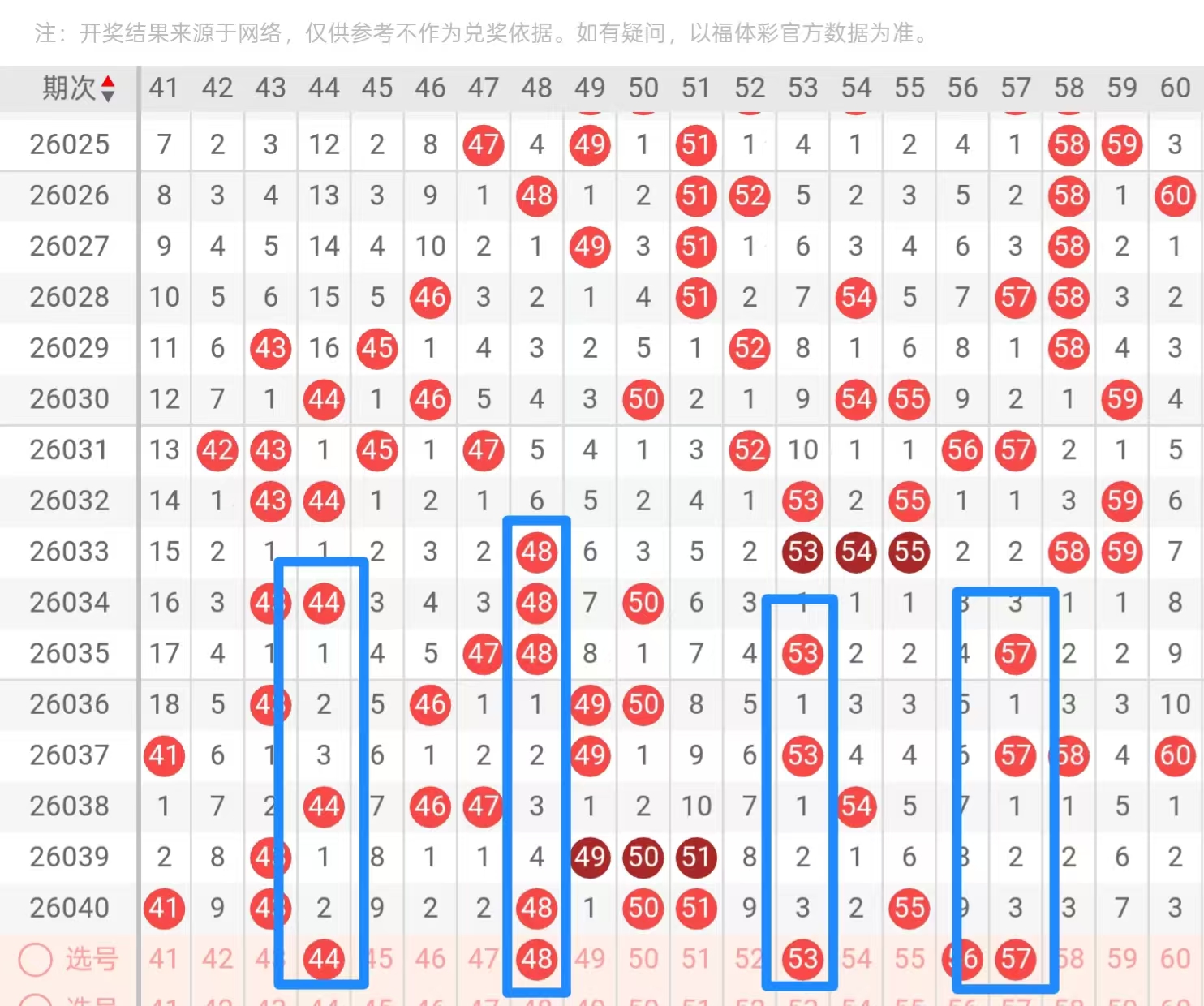 三区41—60:三区上期在出号点位上整体布局较为均衡,那么龙头位置给到了41和43,那么可以关注一个走出形态比较好的还是41,除此之外在筹码的分边当中去考虑号码的话,做44与48的组合搭配较为合适,然后5字头上有一个细小的点,值得大家注意,重空6的开了,一般不建议大家去走重做分边,那么本期的56形态当中还是比较明显的,也值得大家去参考,可以防守56 57的对子,其余的心态当中就没有太强的优势点的话大家就尽量以配好为主。
