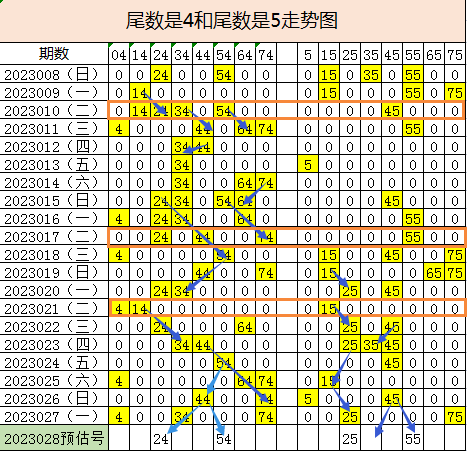 尾数4-5区间:尾数4多以斜开走势开出,二连号三连号居多,