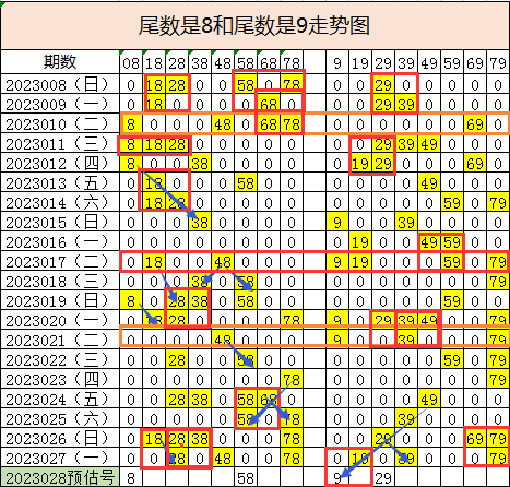 尾数8-9区间:尾数8近20期多以L形,重号,同期连号走势,