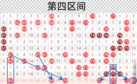 本期的62 65 68在该区间已经遗漏2期了,本期有可能会出号,我们重点关注一下62 68号数字的出号情况吧。本期的75号数字我们要注意一下,三斜连号码75 76 77还是有机会出来的。三连号76 77 78号数字我们也是要注意出重的情况,重点关注一下77 78出重的情况。本期的79号数字是属于V型号码,需要关注一下。本期的80号数字我们防守一下,最近应该是要出了。