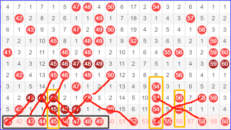 第三区间号码41-60,三区真不是盖的,依然维持了强势的七个号码。从走势划线来看,这一期前半段依然面临着连号的大号走势。后半段随着54-56两个重号的出现,跟一区的08-12一样似乎进入了单兵作战的冷区。这一期如果在本区间选号,不妨重心放于前半段,尤其注意连号的使用。