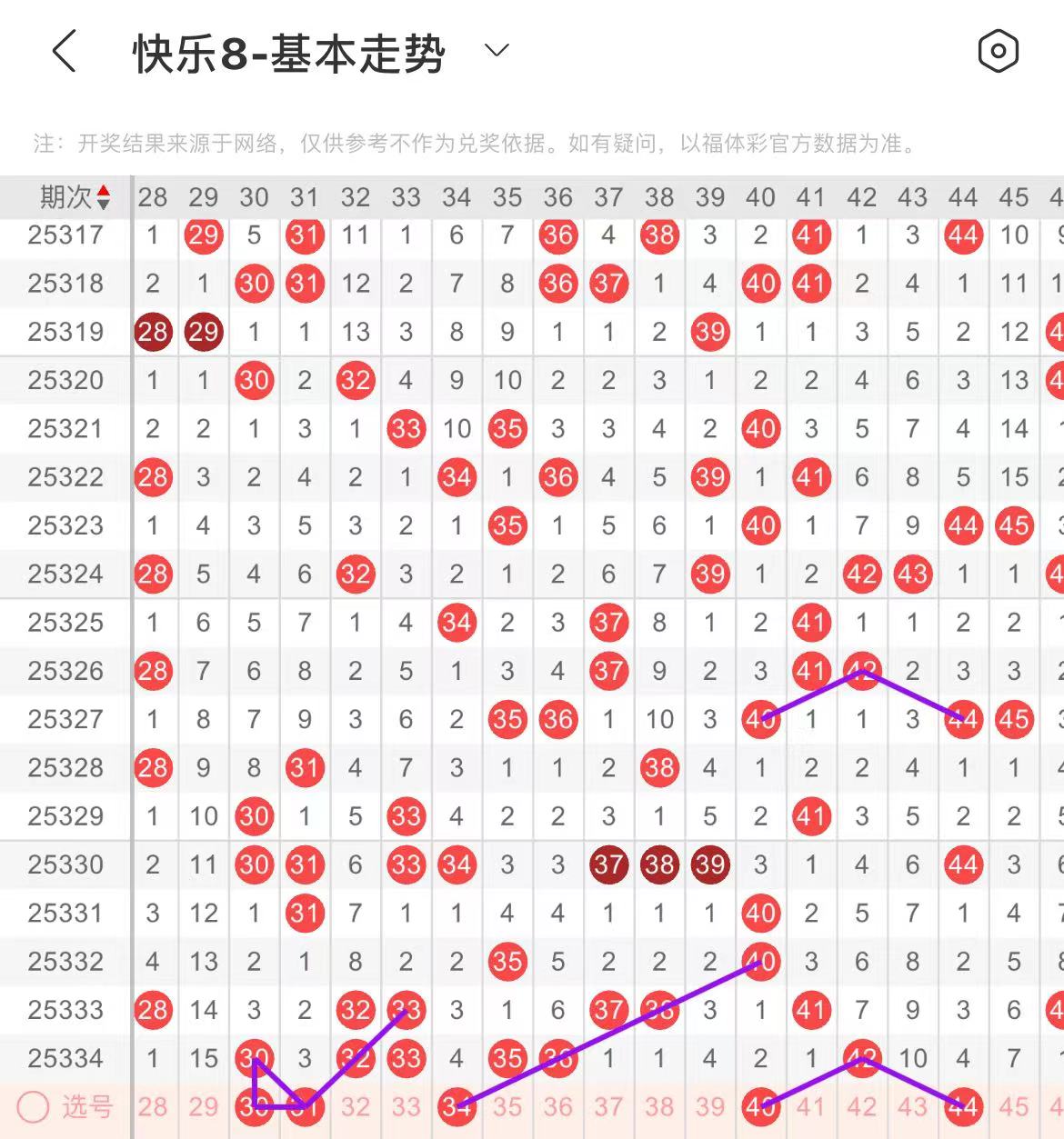 31-40区:本区间上期开出了四个号码,从号码走势图上看,该区现属于温热区,出号个数应该还能保持在三个号码左右,有出号走势的号码有31号,斜连出号走势,34号,斜连且隔期相同出号走势,40号,42对应40出号走势。