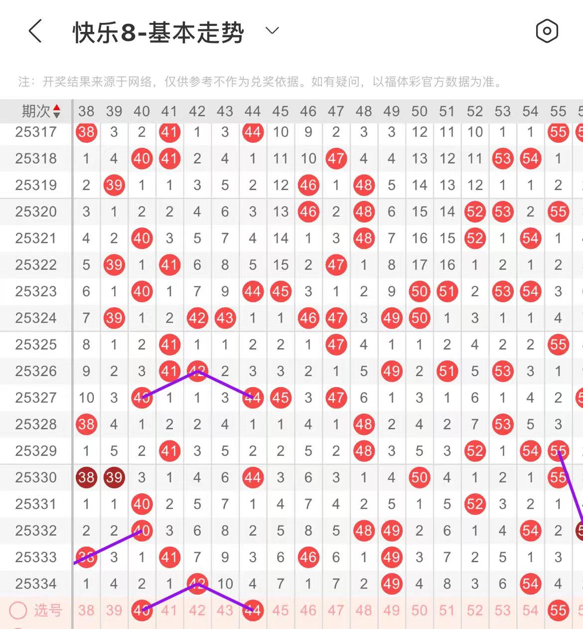 41-50区:本区间上期开出了两个号码,从号码走势图上看,该区现属于冷号区,在选号上建议以防为主,本期出号个数在一个号码或者0个,需要防范的号码有44号,42对应44出号走势。