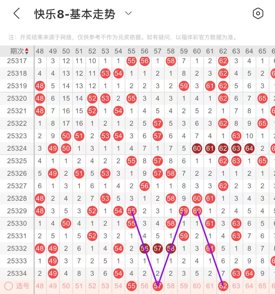 51-60区:本区间上期开出了一个号码,从号码走势图上看,该区号码走势有走冷的趋势,在选号上需谨慎,出号个数在一两个号码左右。有出号走势的号码有57号,双线斜连出号走势,防55.57同出的可能。