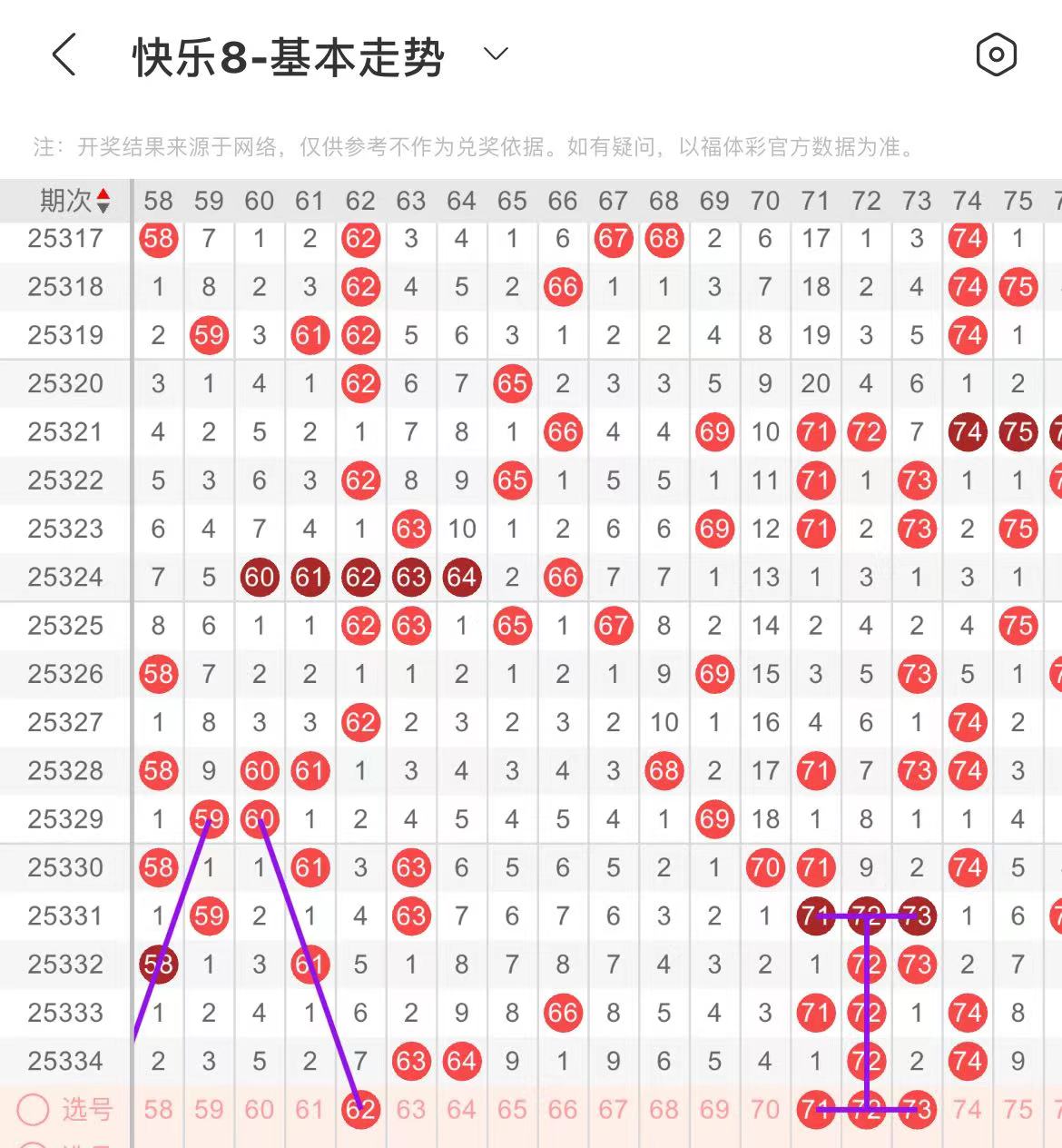 61-70区:本区间上期开出了两个号码,从号码走势图上看,该区现属于冷号区,出号个数在一个号码左右,在选号上建议以防为主,有出号走势的号码有62号,斜连出号走势。