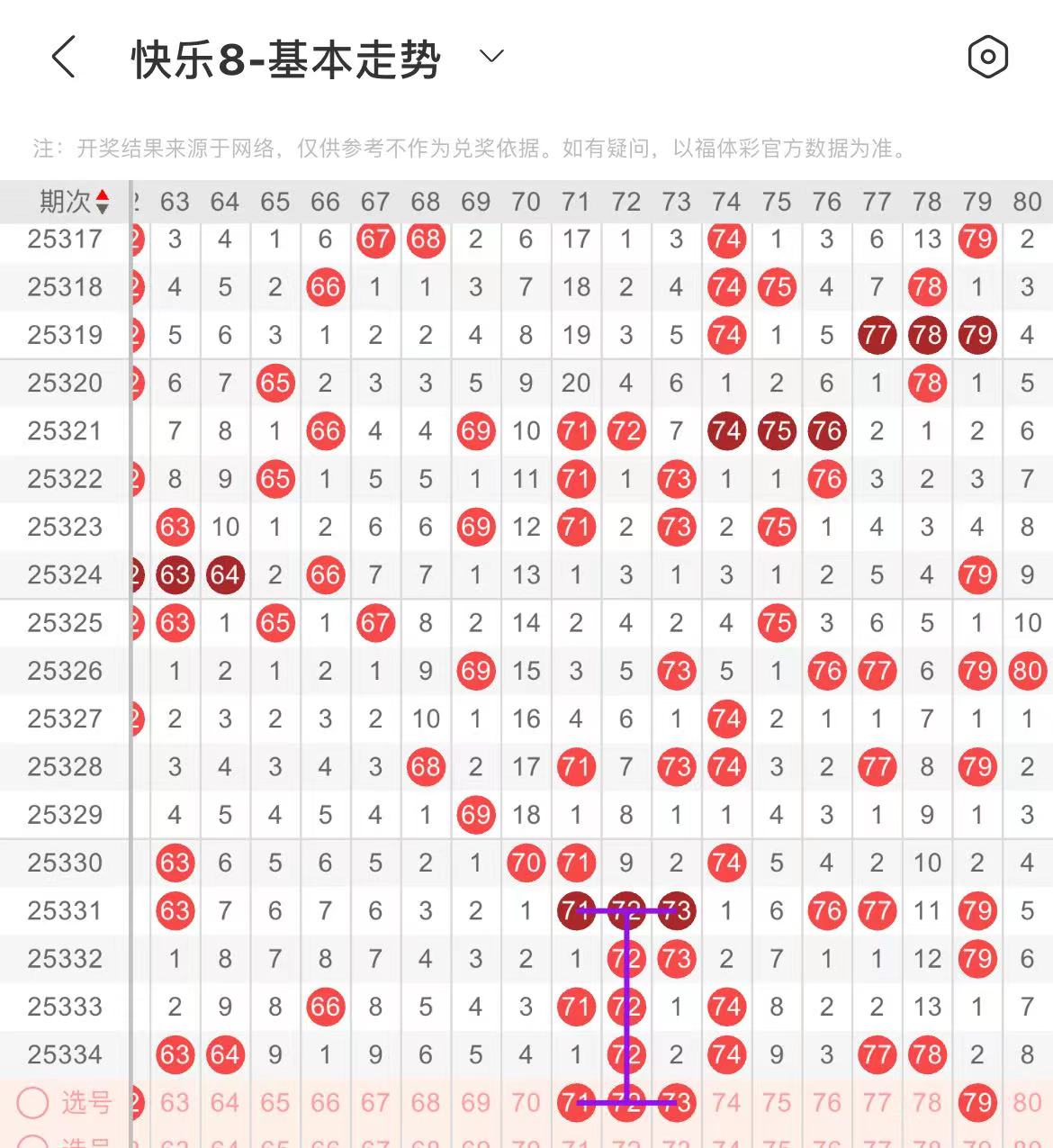 71-80区:本区间上期开出了四个号码,从号码走势图上看,该区现属于热号区,本期出号个数还能保持在四个号码,在选号上可多做选择,有出号走势的号码有71.72.73号,同出,79号,上下对称出号走势。