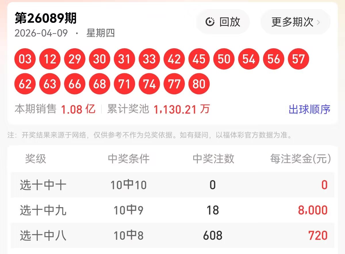 上期福彩快乐8第 2026089期开奖号码为【03 12 29 30 31 33 42 45 50 54 56 57 62 63 66 68 71 74 77 80】,其中大小比14:6,奇偶比为9:11,和值为1003,跨度77,四区间比为2:4:6:8。下面是对本期对于每个号码的详细分析。